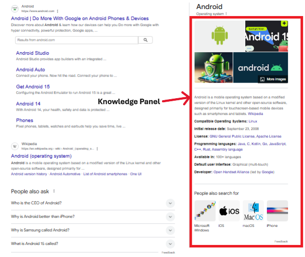 Knowledge panels provide information about a specific entity, such as a business, person, or topic. These appear on the right side of Google’s SERP and offer users quick facts, helping establish credibility.