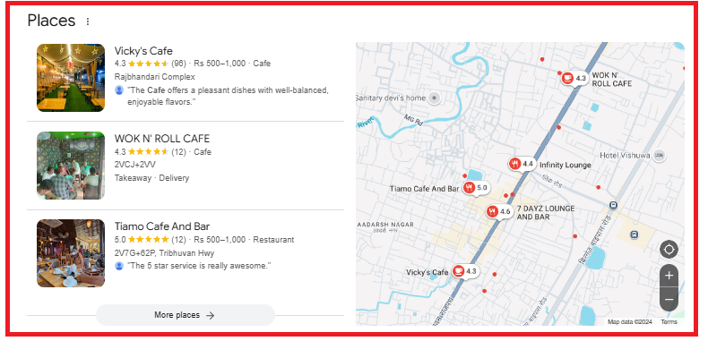 The Local Pack, or “Map Pack,” displays a set of three businesses relevant to a local search query along with a map. It’s essential for companies looking to attract local customers.